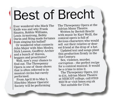 Three Penny Opera’ (partly borrowed from John Gay’s 18th century “Beggars Opera”) , was first performed in Berlin in 1928. Brecht created a world without honor, where relationships were changeable, and betrayals were common among characters who Raul would sell out each other if an advantage was to be gained. It remains the most famous and popular example of what Brecht called “epic theater.” Although it translated the tale of the villainous but irresistible Macheath into the age of Queen Victoria, the show’s real satiric target was Germany’s impoverished middle class in the 1920’s. Using deliberately artificial techniques — painted signs, scene-setting titles, spoken asides and musical-hall songs that often had little to do with the immediate plot — the play was designed to sustain an intellectual distance and allow audiences to see their own reflections in vicious thugs, whores, beggars and policemen motivated by the same primal needs and instincts as themselves. The music, Brecht wrote, was meant to become “an active collaborator in the stripping bare of the middle-class corpus of ideas.”